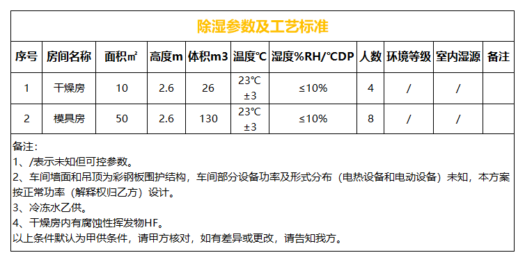 本方案除濕區(qū)域含:干燥房和模具房兩個(gè)大區(qū)域,基于甲供參數(shù)及設(shè)計(jì)選型依據(jù),兩個(gè)區(qū)域內(nèi)分別為4和8人,干燥房內(nèi)有腐蝕性揮發(fā)氣體氟化氫HF,為保護(hù)機(jī)組及域內(nèi)設(shè)備,本區(qū)域采取全新風(fēng)送風(fēng)+回風(fēng)全排方式控制,模具房采用回風(fēng)設(shè)計(jì)。