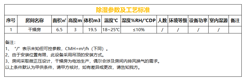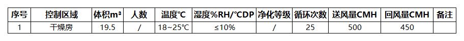 本方案除濕區(qū)域含:干燥區(qū)一個(gè),基于甲供參數(shù)表及設(shè)計(jì)選型依據(jù),該區(qū)域采用一臺(tái)送風(fēng)量500CMH單轉(zhuǎn)輪除濕機(jī)組控制。