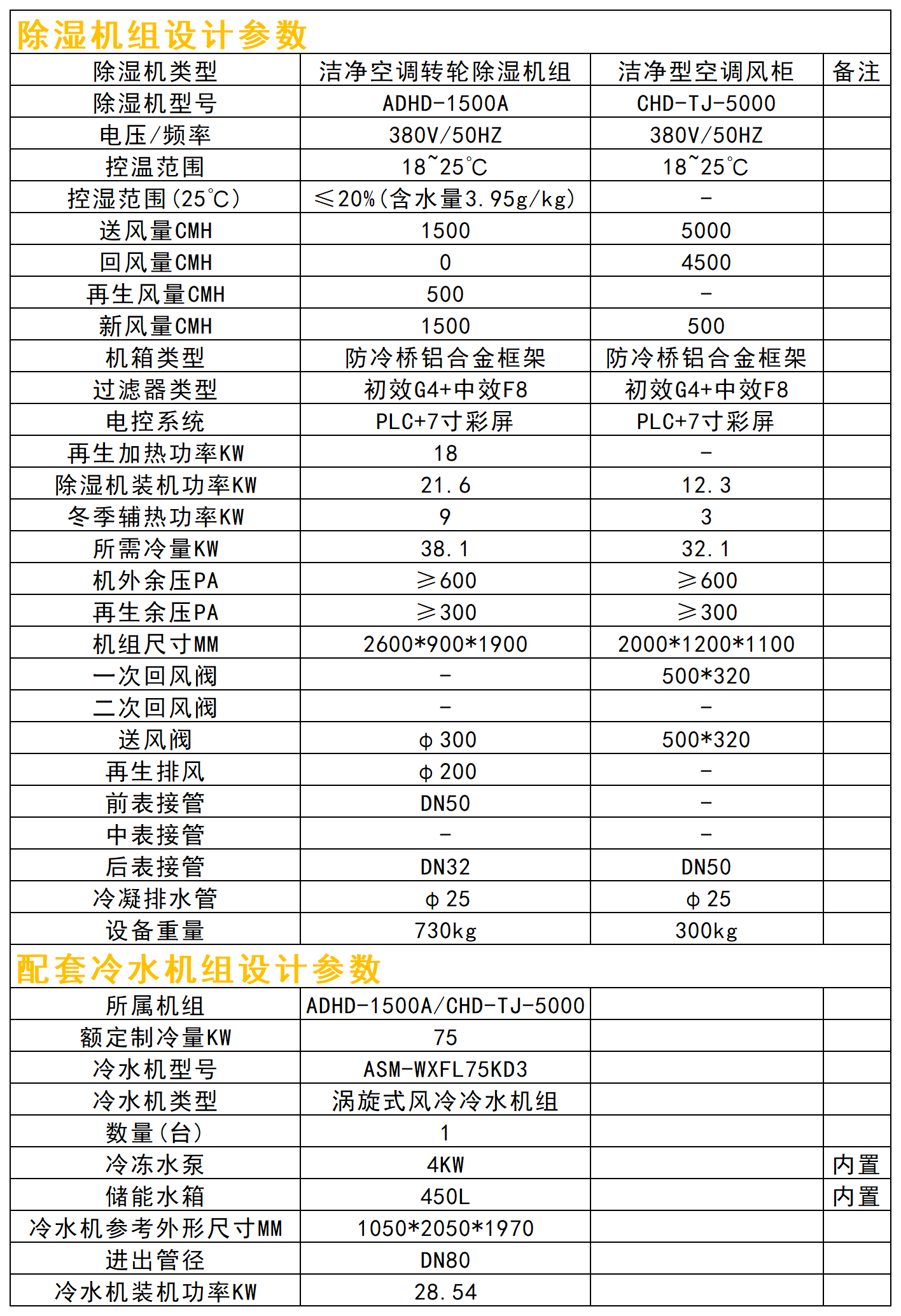 本方案除濕區域含:電子生產大車間及內部小隔間6個,基于甲供參數表及設計選型依據,其中小隔間總體積93.75m3,溫度要求20℃±3,濕度≤20%,除濕區域采用一臺送風量1500CMH,回風量1050CMH的單轉輪除濕機組控制;其中生產大車間體積206.25m3,溫度要求25℃±3,域內有15kw烤箱8臺,散熱量按設備功率的20%計算,除濕區域采用一臺送風量5000CMH,回風量4500CMH潔凈型空調風柜控制。