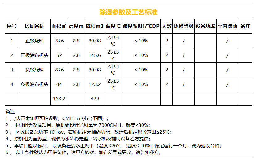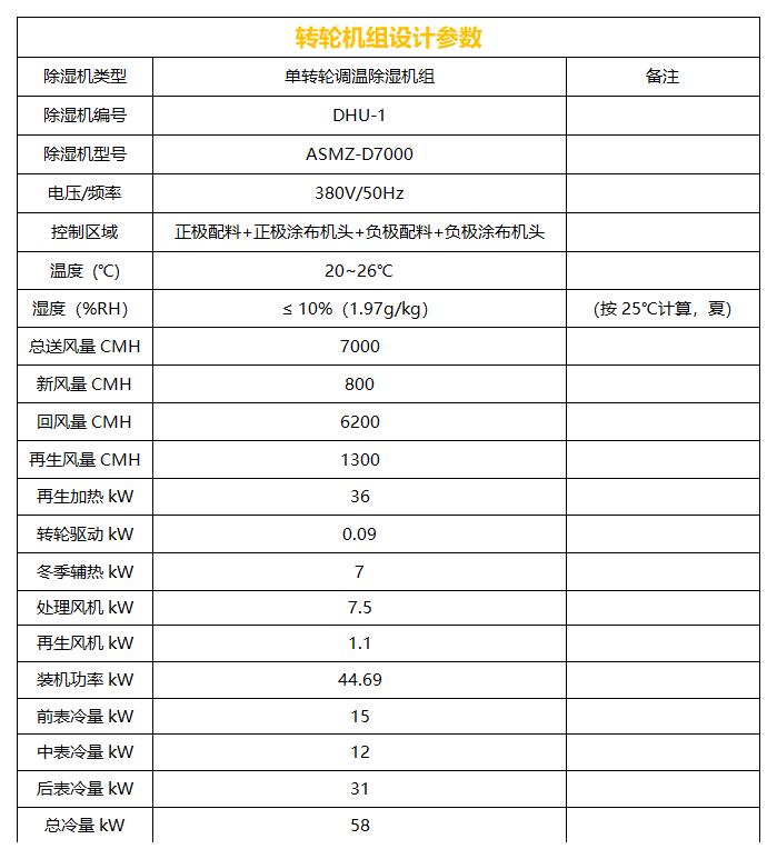 本項(xiàng)目為直膨機(jī)組改造項(xiàng)目,含正極配料 、正極涂布機(jī)頭 、負(fù)極配料 、負(fù)極涂布機(jī)頭四個(gè)區(qū)域,經(jīng)現(xiàn)場(chǎng)勘測(cè),新風(fēng)量為 680CMH,房間密封性良好,管路漏風(fēng)小,且無(wú)大的排風(fēng)設(shè)備;所以制定送風(fēng)量 7000CMH,新風(fēng)量 800CMH, 回風(fēng)量 6200CMH 的改造方案,管道漏風(fēng)率按 2%計(jì)算。