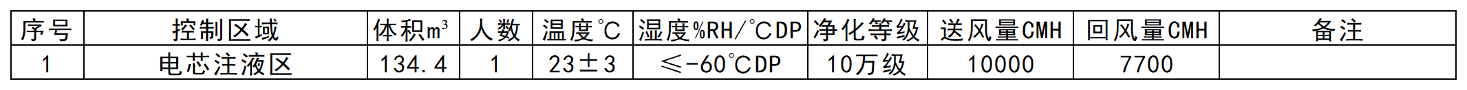 DHU-2除濕區域含:電芯注液區,基于甲供參數及設計選型依據,設計機組送風露點為-70℃DP(含濕量0.003g/kg),房間露點為-60℃DP(含濕量0.012g/kg),人員散濕為100g,則房間送風量Q=100/1.2/(0.012-0.003)=9259,所以此除濕區域采用一臺送風量10000CMH,送風露點-70℃DP雙轉輪除濕機組控制。