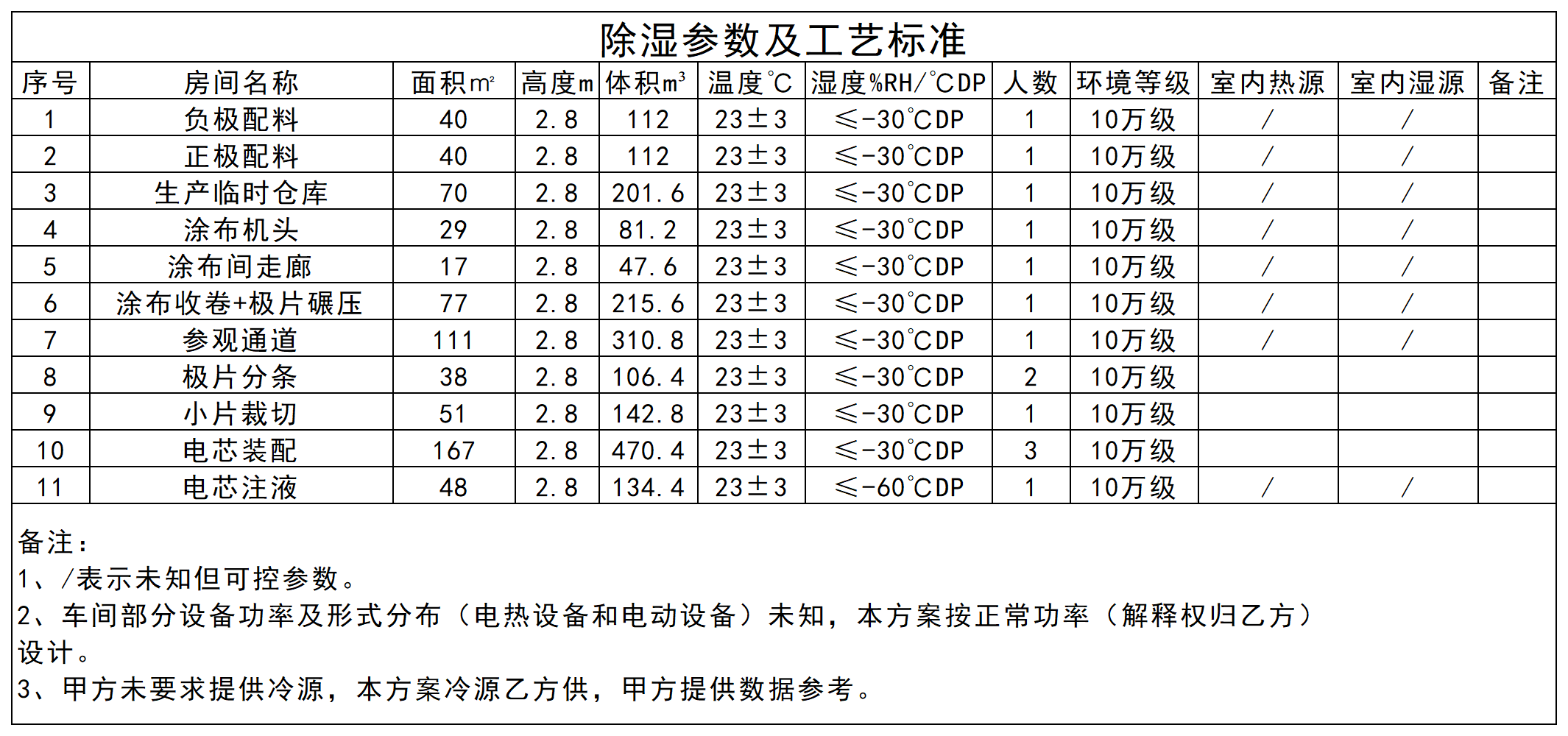 DHU-1除濕區域含:負極配料、正極配料、生產臨時倉庫、涂布機頭、涂布機尾、涂布間走廊、極片碾壓、參觀通道、極片分條、小片裁切及電芯裝配十一個區域,基于甲供參數及設計選型依據,此除濕區域采用一臺送風量29000CMH,回風量23400CMH,送風露點-40℃DP雙轉輪除濕機組控制。