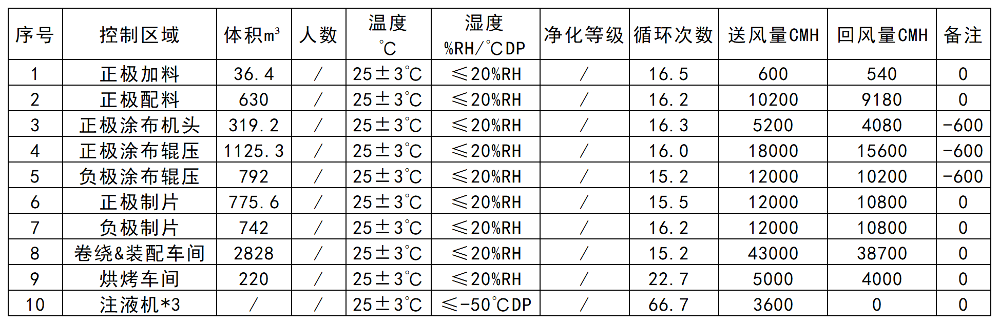 本方案總共10個控濕區域,正極加料、正極配料、正極涂布機頭配置1臺除濕機組(DHU-1);正極涂布輥壓、負極涂布輥壓配置1臺除濕機(DHU-2);正極制片、負極制片配置1臺除濕機(DHU-3);卷繞、裝配車間配置1臺除濕機(DHU-4);烘烤車間配置1臺除濕機(DHU-5);注液機配置3臺除濕機(DHU-6~8),一拖一設計;總共8臺除濕機組。