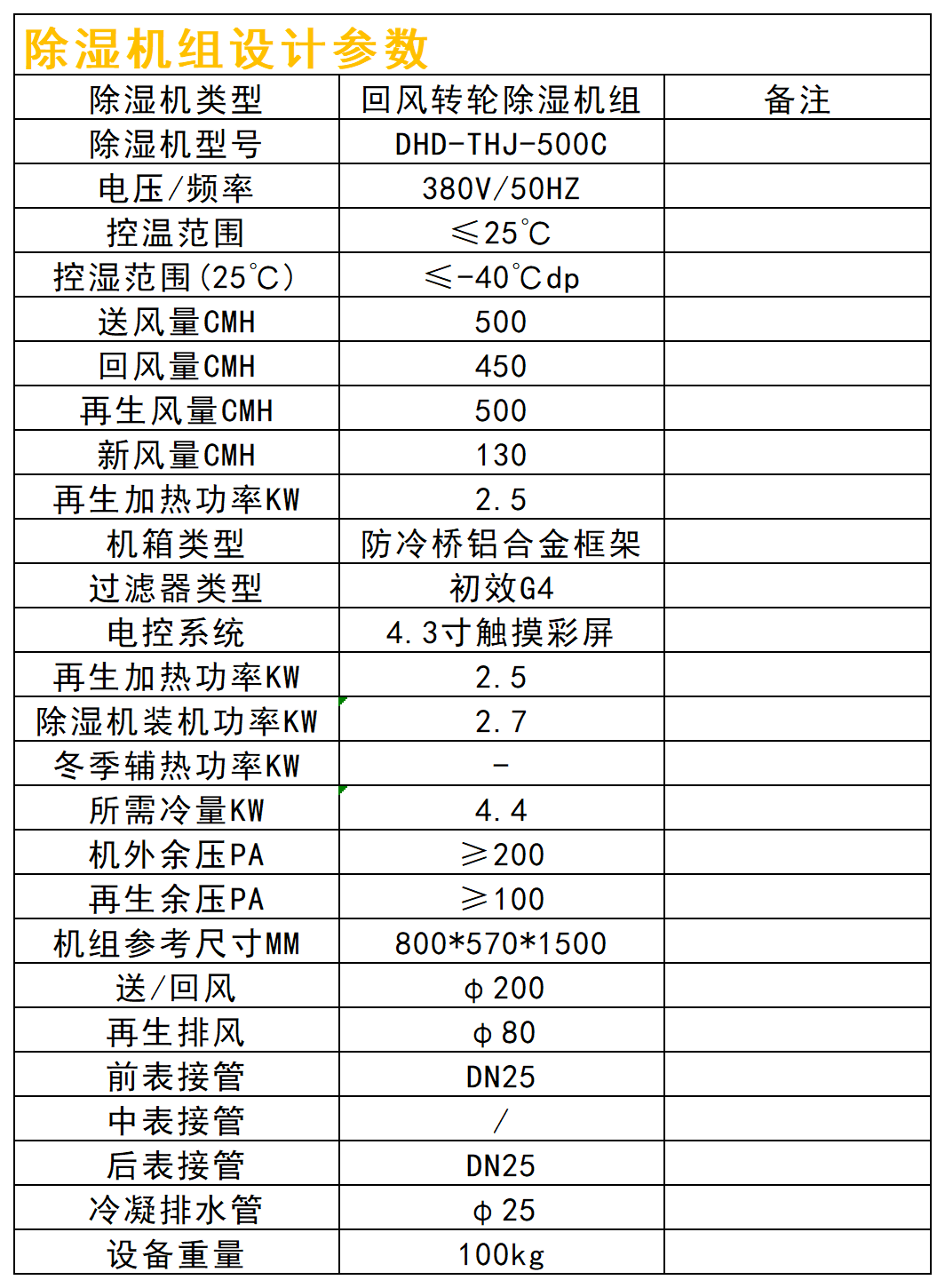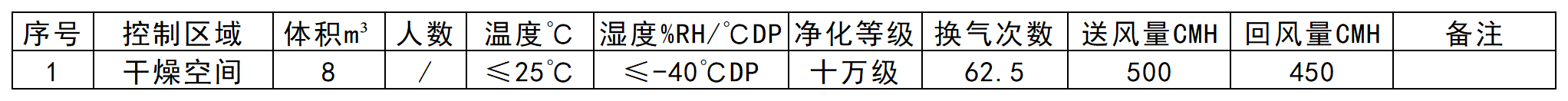 本方案除濕區域含:干燥空間一個區域,基于甲供參數表及設計選型依據,該方案采用一臺超低露點單轉輪C型除濕機組控制。