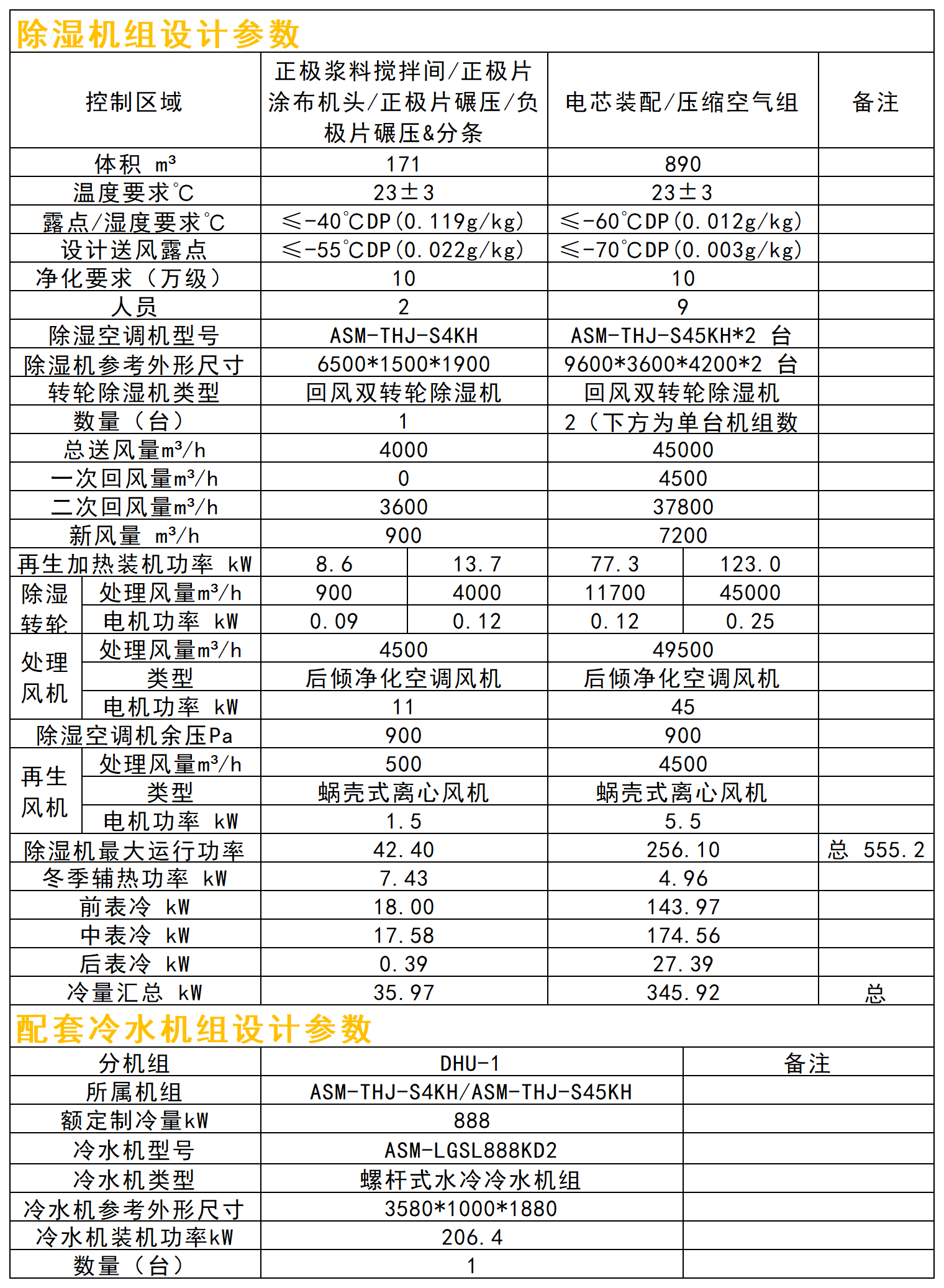 本項目除濕區域含正極漿料攪拌間、正極片涂布機頭、正極涂布機、正極片碾壓&分條、負極片碾壓、電芯裝配、壓縮空氣機房、3 樓拆解室、4 樓軟包小試線 9 個區域,分為≤-40℃DP(0.119g/kg)和≤-60℃DP(0.012g/kg)兩個濕度梯隊,基于甲供參數及設計選型依據,正極漿料攪拌間、正極片涂布機頭、正極片涂布機、正極片碾壓&分條、負極片碾壓、掃描電鏡、裝配間及空壓機房設計送風露點≤-70℃DP(0.003g/kg),其送風量 90000CMH,回風量84600CMH,新風量 14400CMH 的雙轉輪除濕機組控制,由于受轉輪大小限制,此區域分兩臺45000CMH 機組 DHU-1~2 控制;3 樓拆解室及 4 樓軟包實驗室兩個區域設計送風露點≤-55℃DP(0.022g/kg),其送風量 4000CMH,回風量 3600CMH,新風量 900CMH 的雙轉輪除濕機組 DHU-3控制。